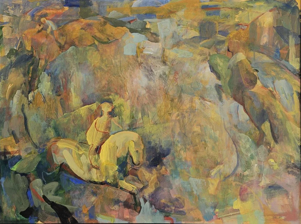 Often populated by enigmatic equestrian riders, Portwood’s narratives emerge or hide in alternating rhythms. His colorwork is bold and harmonious with fresco-like layers. Under-drawings remain visible through delicate washes of tint, patches of painted canvas add texture and shapes are augmented with incised lines created with the heel of a brush.